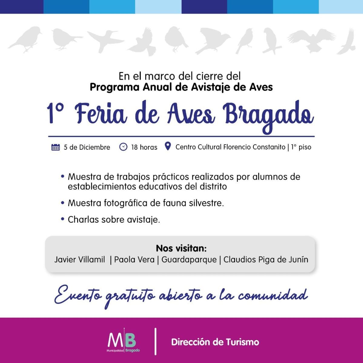 Este lunes 5 de diciembre, a las 18 horas, se inaugurará en el Constantino la 1° “Feria de Aves Bragado”. Un evento diferente que se desarrollará a partir de las salidas de avistajes de aves, siendo una actividad educativa y cultural que promueve la Oficina de Turismo de la Municipalidad de Bragado.