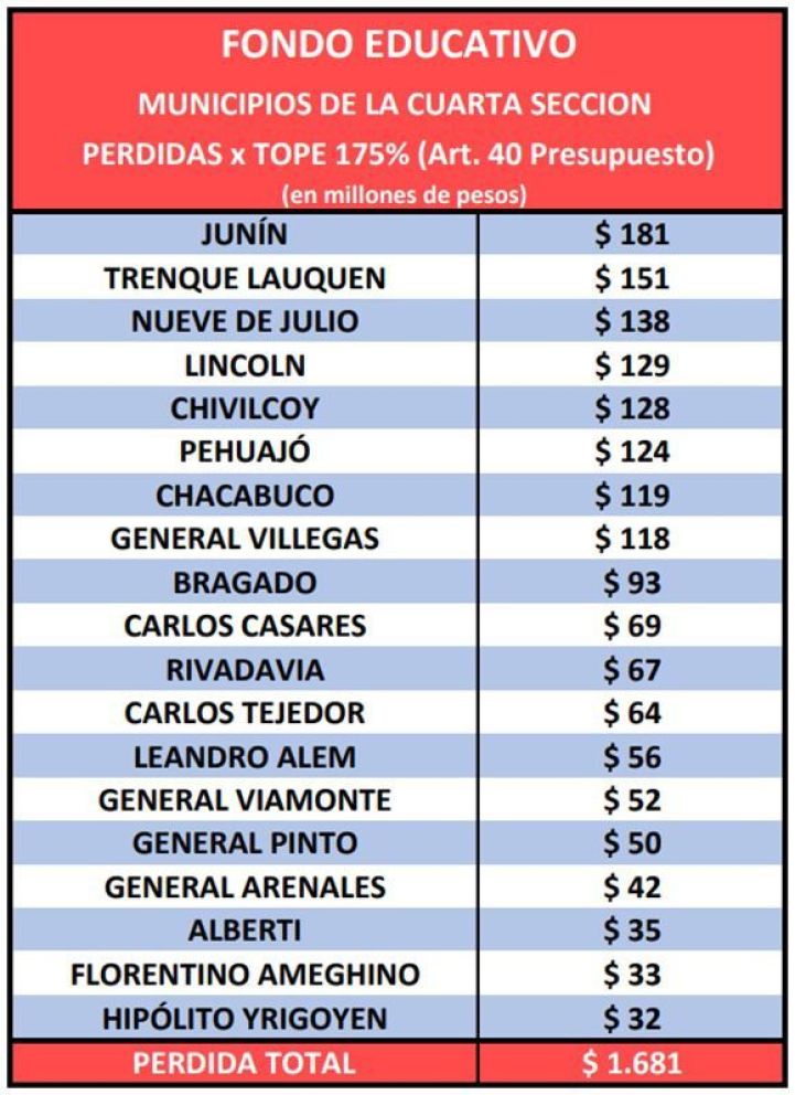 “En el caso de Junín, concretamente, el Gobierno local tendrá 181 millones menos de lo que tendría que tener; o por ejemplo Trenque Lauquen 151 millones menos; Nueve de Julio, 138; y Lincoln, 129 millones menos, por citar algunos ejemplos. De todos modos, esto afecta no sólo a la Cuarta Sección electoral, sino a toda la Provincia, ya que vemos distritos como La Matanza que perderían 2 mil millones de pesos para ser afectados al sistema educativo”, lamentó Daletto.