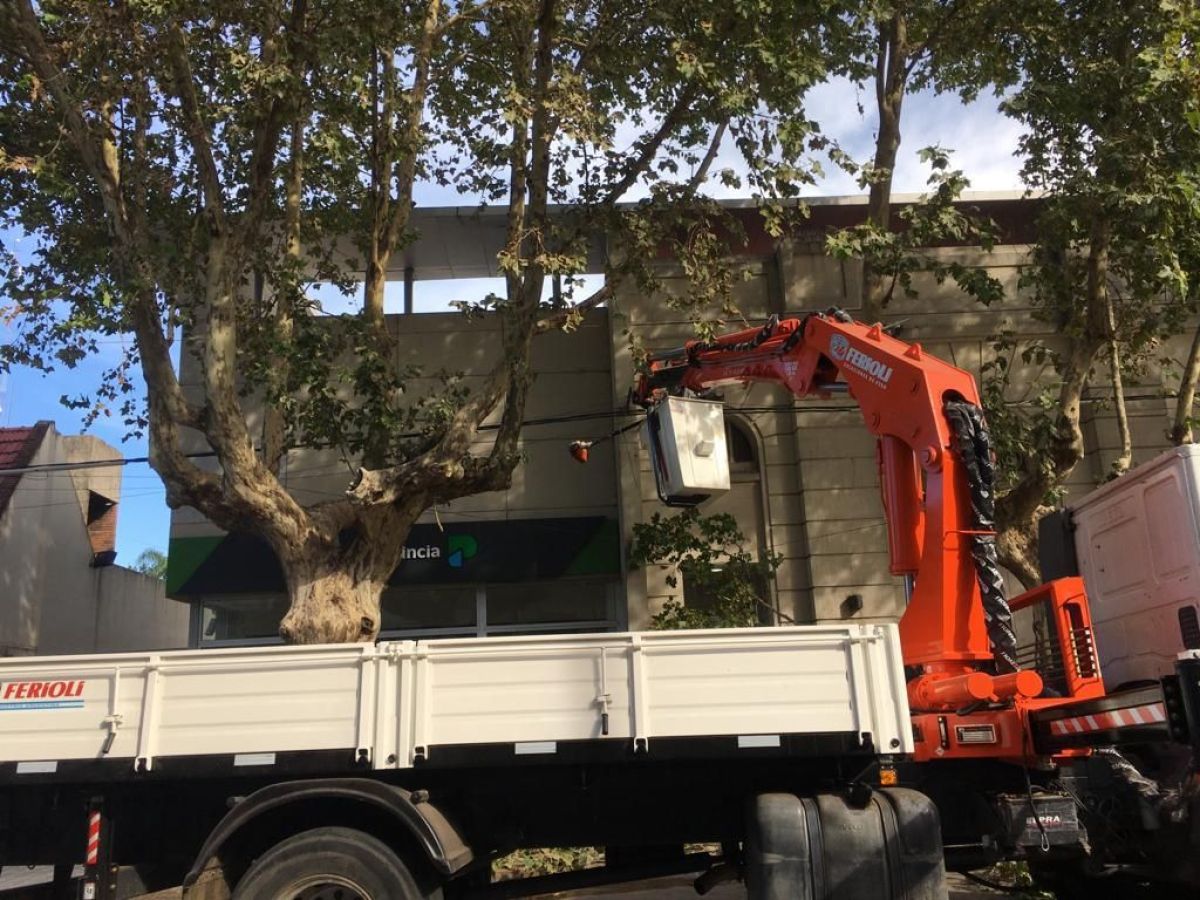Hoy por la mañana, se pudo ver que el personal municipal se encontraba realizando una poda de despeje en la esquina del Banco Provincia (Pellegrini y Rauch) ante la superpoblación de aves q hay en el lugar.