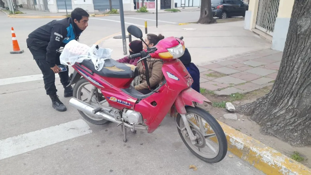 El impacto ocurrió en una esquina céntrica que tiene semáforo, exactamente en Pellegrini y Alsina. La moto era conducida por una mujer que circulaba con dos menores de edad, uno lo llevaba adelante y otro atrás.