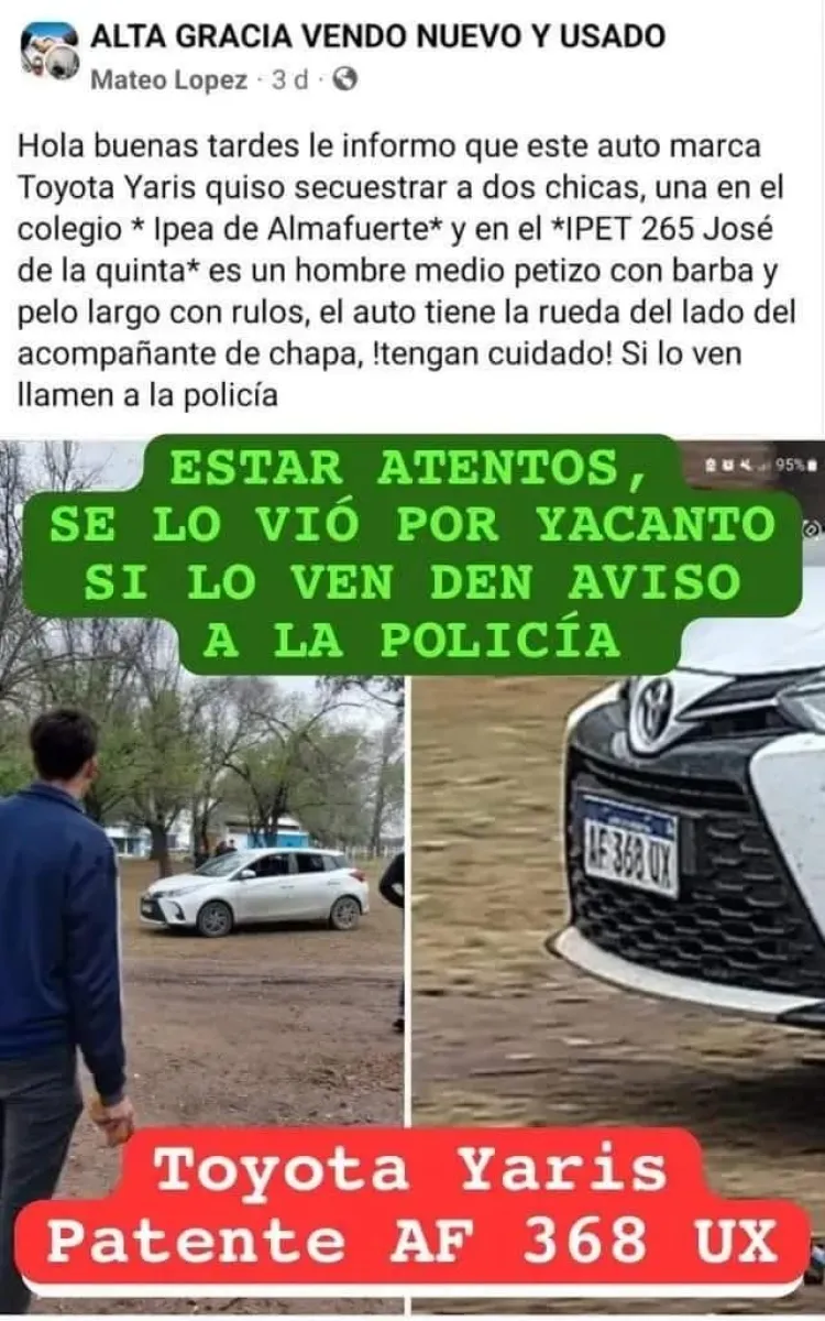 De acuerdo a lo publicado en la cuenta de facebook de Rtl Villa Yacanto de Calamuchita, se supo que este individuo, días atrás, habría querido llevarse a una nena de un colegio en Almafuerte, al mismo se lo vió en Villa Yacanto, ambas localidades pertenecen a Córdoba.