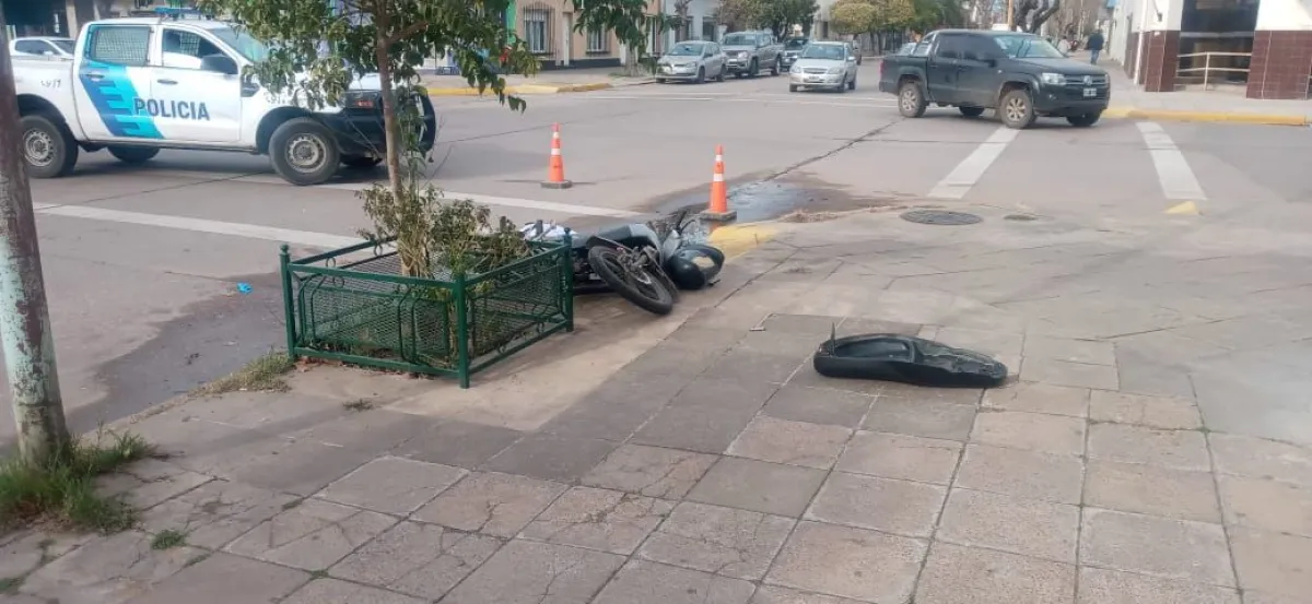 Una moto 110 cc. circulaba por la calle Pellegrini cuando al llegar a la esquina de Necochea impactó contra un vehículo marca Chevrolet Agile conducido por Melina Elizabet Melo.