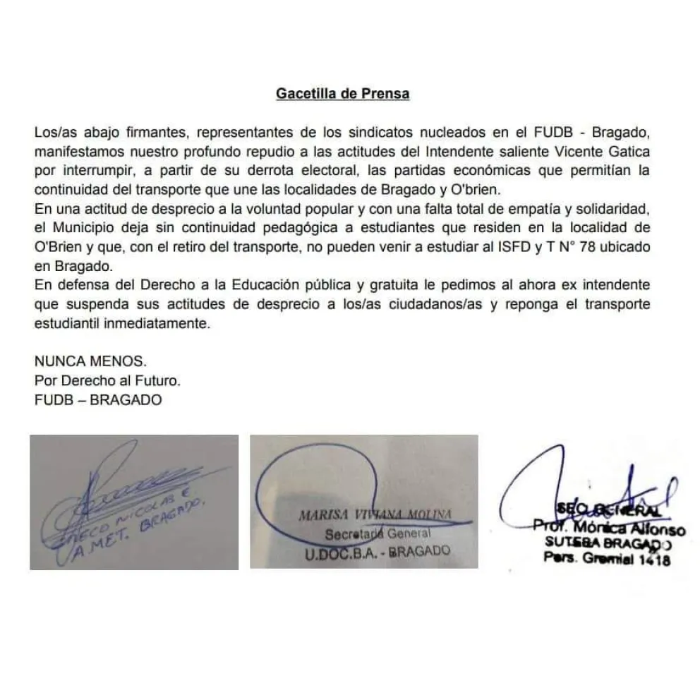 En el mismo detallan que “manifestamos nuestro profundo repudio a las actitudes del intendente saliente Vicente Gatica por interrumpir, a partir de su derrota electoral, las partidas económicas que permitían la continuidad del transporte que une las localidades de Bragado y O’Brien”.