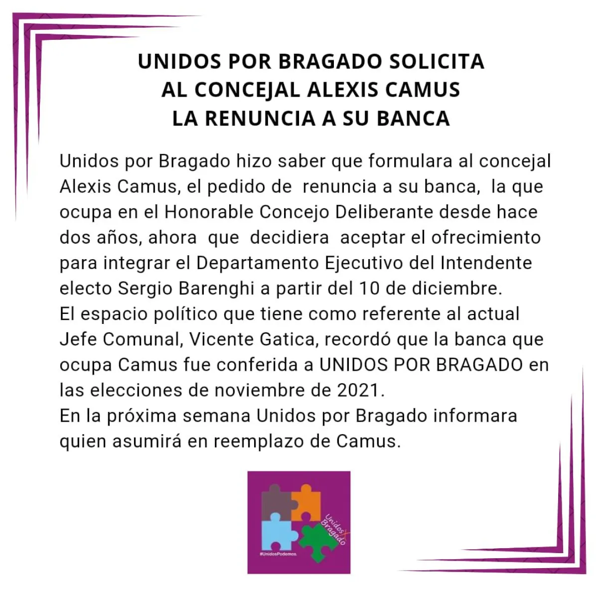 “Unidos por Bragado hizo saber que formulará al concejal Alexis Camus, el pedido de renuncia a su banca, el pedido de renuncia a su banca, la que ocupa en el Honorable Concejo Deliberante desde hace dos años, ahora que decidiera aceptar el ofrecimiento para integrar el Departamento Ejecutivo del Intendente electo Sergio Barenghi a partir del 10 de diciembre.