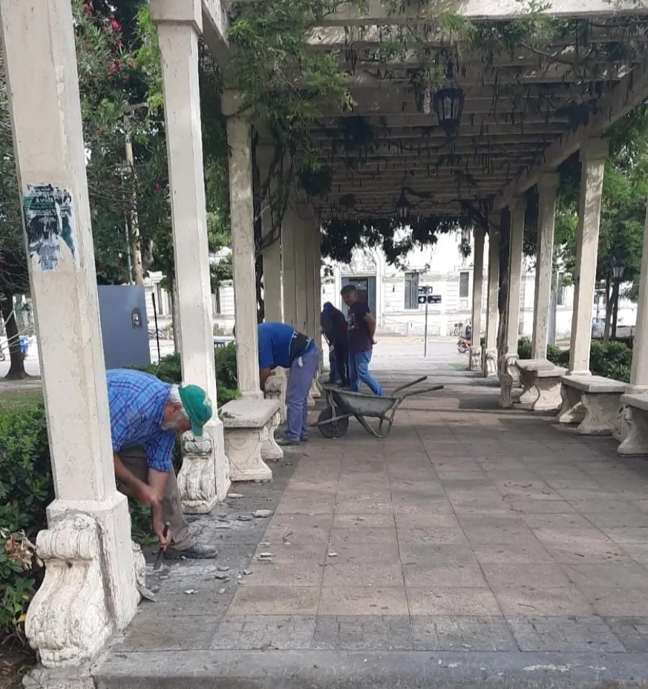 La Secretaría de Obras Públicas destacó que las cuadrillas de mantenimiento realizan tareas de reconstrucción de la infraestructura de la plaza principal.