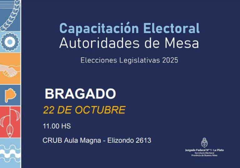 Con el objetivo de garantizar un correcto desarrollo de las próximas Elecciones Legislativas 2025, el Juzgado Federal N°1 de La Plata, a través de la Secretaría Electoral, convoca a las autoridades de mesa designadas en Bragado a participar de una capacitación presencial.