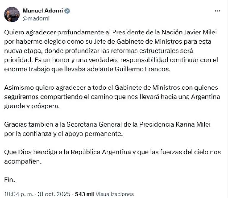 Adorni agradeció la designación a través de la misma red social: “Es un honor y una verdadera responsabilidad continuar con el enorme trabajo que llevaba adelante Guillermo Francos", expresó.