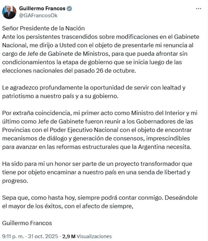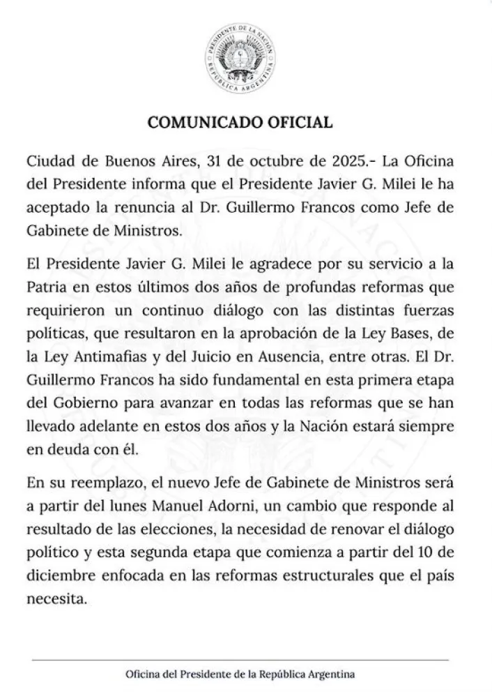 La cadena de renuncias comenzó con una publicación de Francos en la red social X (anteriormente Twitter), donde comunicó su decisión de dejar el cargo. Poco después, la Oficina del Presidente informó oficialmente que Manuel Adorni, hasta entonces vocero presidencial, será quien lo reemplace al frente de la Jefatura de Gabinete.
