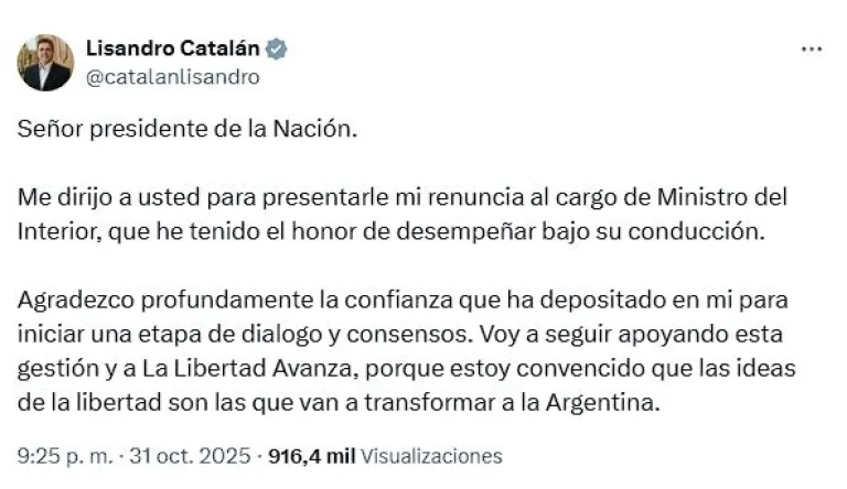 En tanto, Lisandro Catalán también anunció su salida del Ministerio del Interior mediante un comunicado en X. Hasta el momento, no se confirmó quién será su reemplazo.