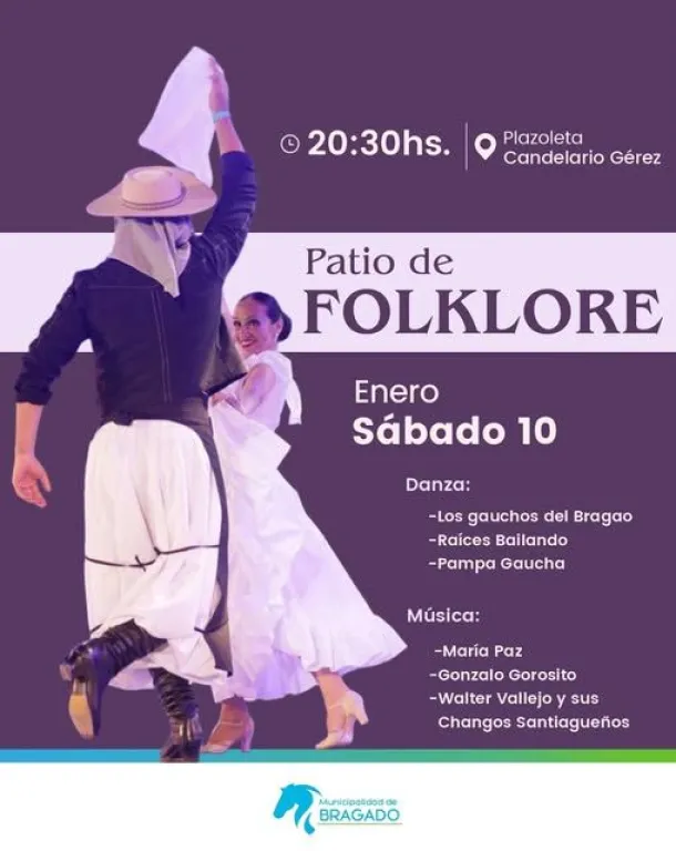 El verano cultural en Bragado continúa con una propuesta pensada para toda la familia: el regreso del tradicional Patio de Folklore. La actividad se llevará a cabo el sábado 10 de enero a partir de las 20:30 horas en la emblemática Plazoleta Candelario Gérez, ofreciendo una noche llena de música, baile y el espíritu de peña que caracteriza al folklore argentino.