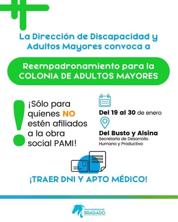 La Dirección para Adultos Mayores informa que del 19 al 30 de enero se realizará el reempadronamiento de la Colonia de Adultos Mayores, destinado exclusivamente a personas que no estén afiliadas a PAMI.