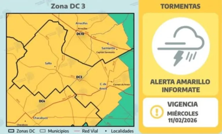 Con el avance del frente frío, durante la madrugada y las primeras horas de la mañana del miércoles 11, se prevén vientos intensos en la zona DC 6, el oeste de DC 4 y DC 11, y tormentas de variada intensidad, algunas localmente fuertes, en las zonas DC 4, oeste de DC 3 y sudoeste de DC 10.